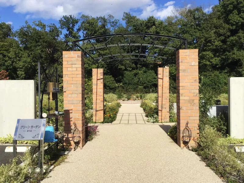 バラのアーチを潜り抜けると、多くの植栽に彩られた美しい公園のような区画が広がります。