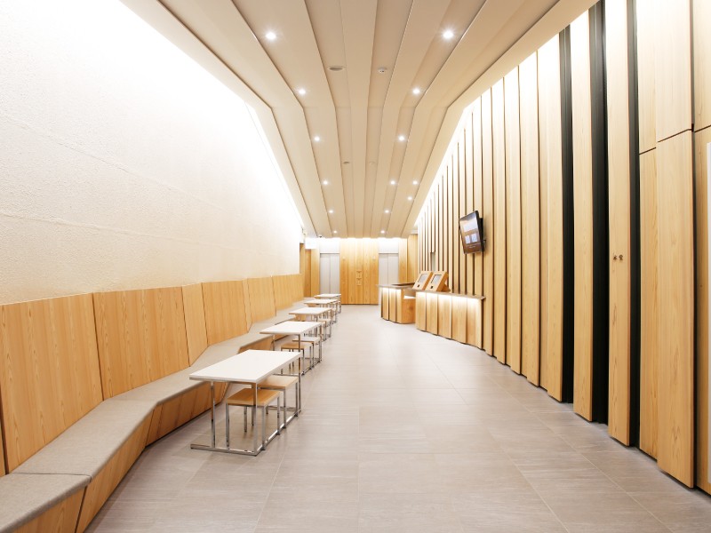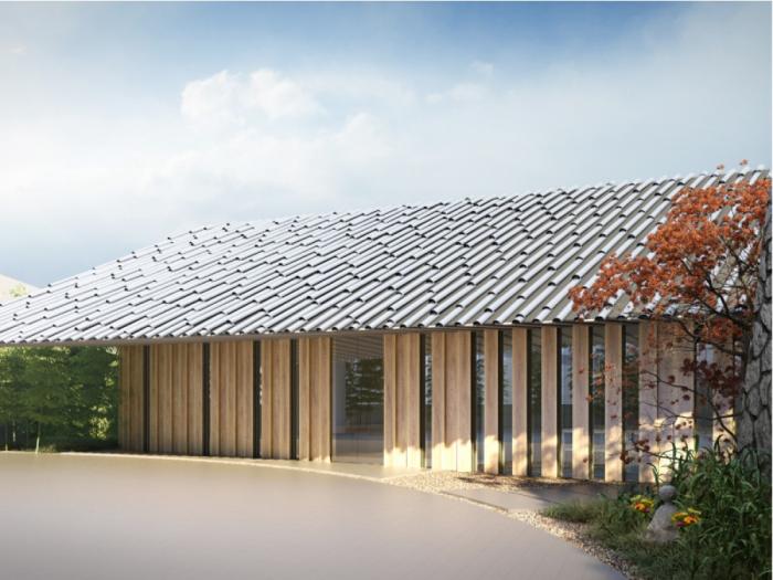 基本デザインは、東京オリンピックの新国立競技場も手掛ける隈研吾氏。和の風情を印象づけるアルミの丸瓦と豊かな陰影を生む大和張りのファサード、建築と自然をつなぐ勾配屋根がつくるメリハリのある外観。 エントランスは外部と連続する大和張りの壁と天井、ヒューマンスケールな和紙の重ね貼りがお迎えいたします。
