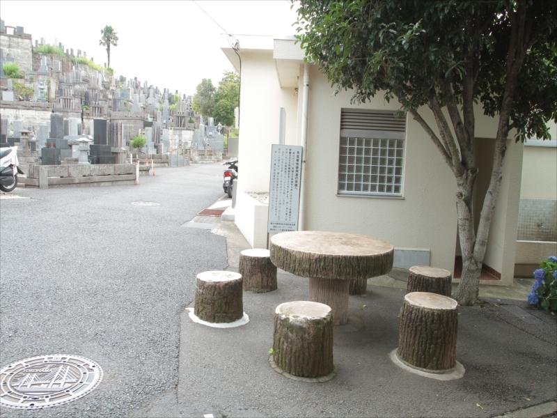 霊園の休憩所はありませんが、墓地周囲にはお茶屋さんが数件並んでいるので休憩もできますし、お花・お線香もお茶屋さんで購入する事が出来ます。