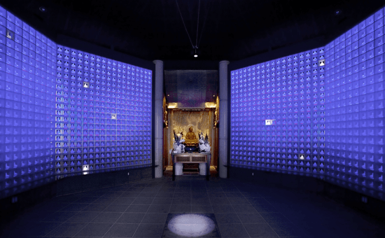 このガラスで仏像を形どった琉璃基を遺骨の前に設置しLEDにより光明あふれる世界を表現した納骨堂。