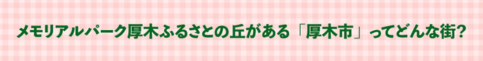 2021年住みたい街No.1「本厚木駅」がある厚木市は人口が22万人を超え、丹沢山や相模川などの自然豊かな環境と観光のリソースである温泉やいちご狩り、大きなイベントで有名な街となっています。メモリアルパーク厚木ふるさとの丘にお墓を持つことで、霊園を中心にショッピングやレジャー、観光まで一年通して楽しめますので、お墓参りの一日の過ごし方が広がります。