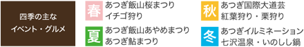 | 厚木市は、この街ならではの四季折々のイベントやグルメが充実!大人から子供まで、四季を感じながら、おいしいグルメと大自然を味わえます。 |