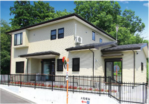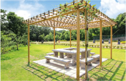 | 和の風情を感じる外観の管理棟に備える休憩スペースはいつでも気軽にご利用いただけます。 | 墓域随所に設けた休憩スペース。お墓参りの途中で休憩できるので安心です。豊かな自然を身近に感じながらゆったりお寛ぎいただけます。 |