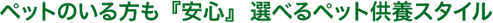 長年連れ添い共に過ごしてきた大切な家族の一員ペットといつまでも一緒にいたい・・・そんなペットのいる方々の想いを大切に考え、手厚く多様なペット供養スタイルをご用意しております。「人とペットが一緒に眠れるお墓」のほか、「ペット専用のお墓」も選択可能です。 |