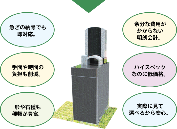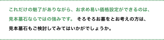 見本墓石とは、自分好みのデザインで1から作り上げるオーダーメイドのお墓ではなく、お墓の加工・研磨・据付工事が完了した完成した墓石のことをいいます。